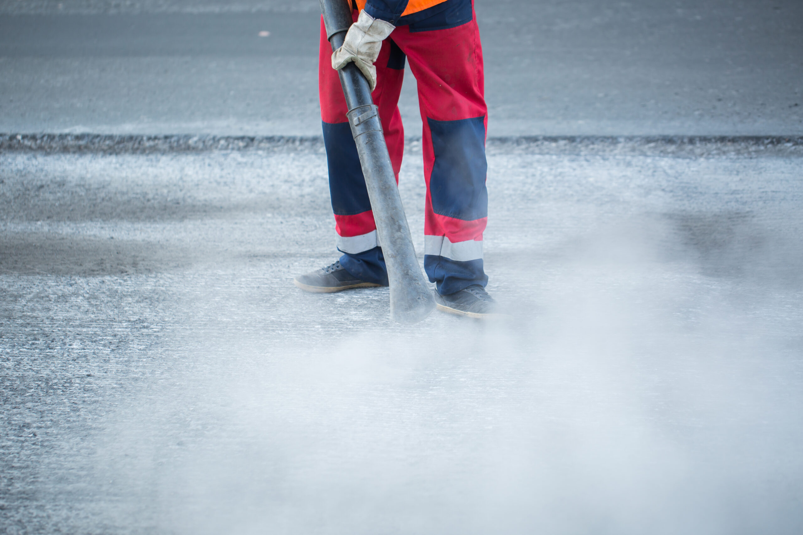 Worker with leaf-blower, cleaning out the dust for better asphalt adhesion, during tram track renewal works